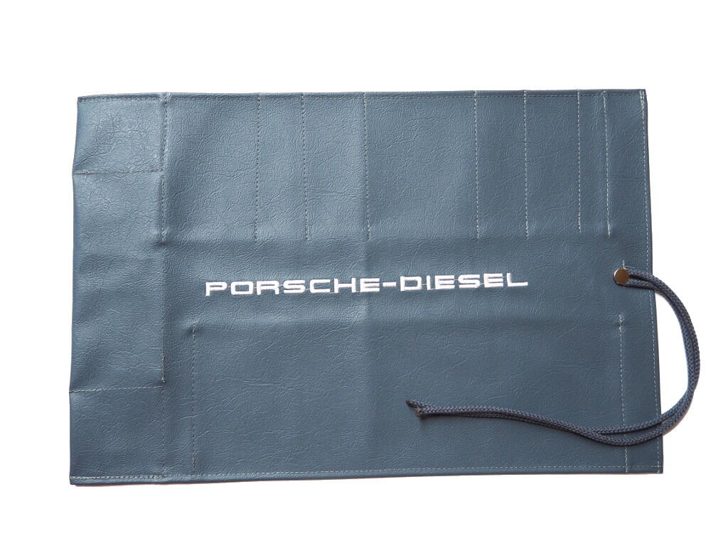 Entspricht von der Aufmachung her der Tasche, die original dem Traktor von Porsche-Diesel beigelegt wurde. Das graue Kunstleder ist mit einem weißen Schriftzug „Porsche-Diesel“ bestickt. Ebenso sind Taschen für das Werkzeug eingestickt. Hochwertige Verarbeitung aus deutscher Produktion.
